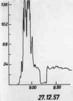 receiver internal noise coincides with the time axis. In the catalogue all the records are arranged in chronological order. Each record has an ordinal number. Additional data on the events are listed in the table 1. It contains the ordinal number of the record, date, time interval, beginning and end, type of phenomenon and intensity flux. As it is seem about 1/3 of the events in the solar radio emission occurred in the periods when there were no chromosphere flares. In most cases this can be explained by the fact that single bursts and short-lived groups of bursts often occur both during subflares and other active processes on the Sun (such as short-lived brightening of a flocculus and fast movement of fibres in the magnetic fields of spots), and also that in some periods of registration of the solar radio emission there could be no optical observation of the bursts. Besides, the solar radio emission bursts can be registered during the flares beyond the limb which cannot be observed by optical methods.