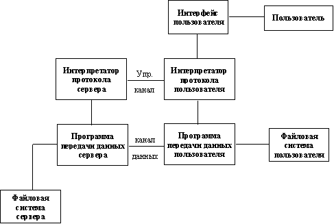 Протокол FTP (File Transfer Protocol)FTP (File Transfer Protocol или "Протокол Передачи Файлов") - один из старейших протоколов в Internet и входит в его стандарты. Обмен данными в FTP проходит по TCP-каналу. Построен обмен по технологии "клиент-сервер". На рисунке изображена модель протокола.