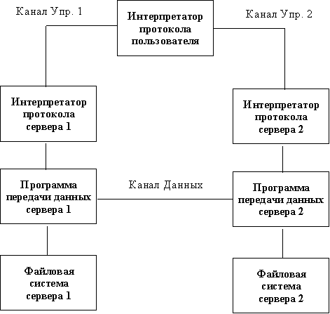 Модель протокола В FTP соединение инициируется интерпретатором протокола пользователя. Управление обменом осуществляется по каналу управления в стандарте протокола TELNET. Команды FTP генерируются интерпретатором протокола пользователя и передаются на сервер. Ответы сервера отправляются пользователю также по каналу управления. В общем случае пользователь имеет возможность установить контакт с интерпретатором протокола сервера и отличными от интерпретатора пользователя средствами. Команды FTP определяют параметры канала передачи данных и самого процесса передачи. Они также определяют и характер работы с удаленной и локальной файловыми системами. Сессия управления инициализирует канал передачи данных. При организации канала передачи данных последовательность действий другая, отличная от организации канала управления. В этом случае сервер инициирует обмен данными в соответствии с параметрами, согласованными в сессии управления. Канал данных устанавливается для того же host'а, что и канал управления, через который ведется настройка канала данных. Канал данных может быть использован как для приема, так и для передачи данных. Возможна ситуация, когда данные могут передаваться на третью машину. В этом случае пользователь организует канал управления с двумя серверами и организует прямой канал данных между ними. Команды управления идут через пользователя, а данные напрямую между серверами. Канал управления должен быть открыт при передаче данных между машинами. В случае его закрытия передача данных прекращается.