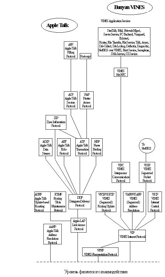 Архитектура обеспечивает возможности взаимодействия абонентов как на основе ЛВС, так и на основе глобальных сетей типа Х.25. Она имеет шестиуровневую структуру: физический, канальный, фрагментации, сетевой, транспортный, прикладной. Протокол фрагментации обеспечивает разбиение исходных протокольных блоков на сегменты и их последующее восстановление. Основным межсетевым протоколом является VIP (Vines Internet Protocol). Основным транспортным протоколом - IPC. Кроме того, архитектура допускает использование протоколов других сетевых архитектур. |
